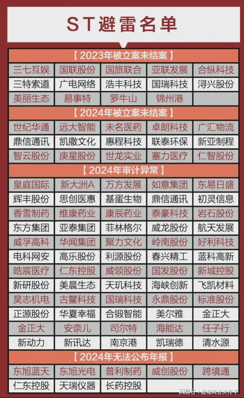 今天我重新整理了一份ST避雷名单,里面主要包含2023年被立案未结案,2024立案未结案的,还有2024年审计异常的或者无法公布年报的企业,还有最新退市风险提示名单,已经全部整理好,放到文章的下方,建议大家可以先点赞收藏,也可以关注,转发分享给更多有需要的朋友,赠人玫瑰,手有余香。